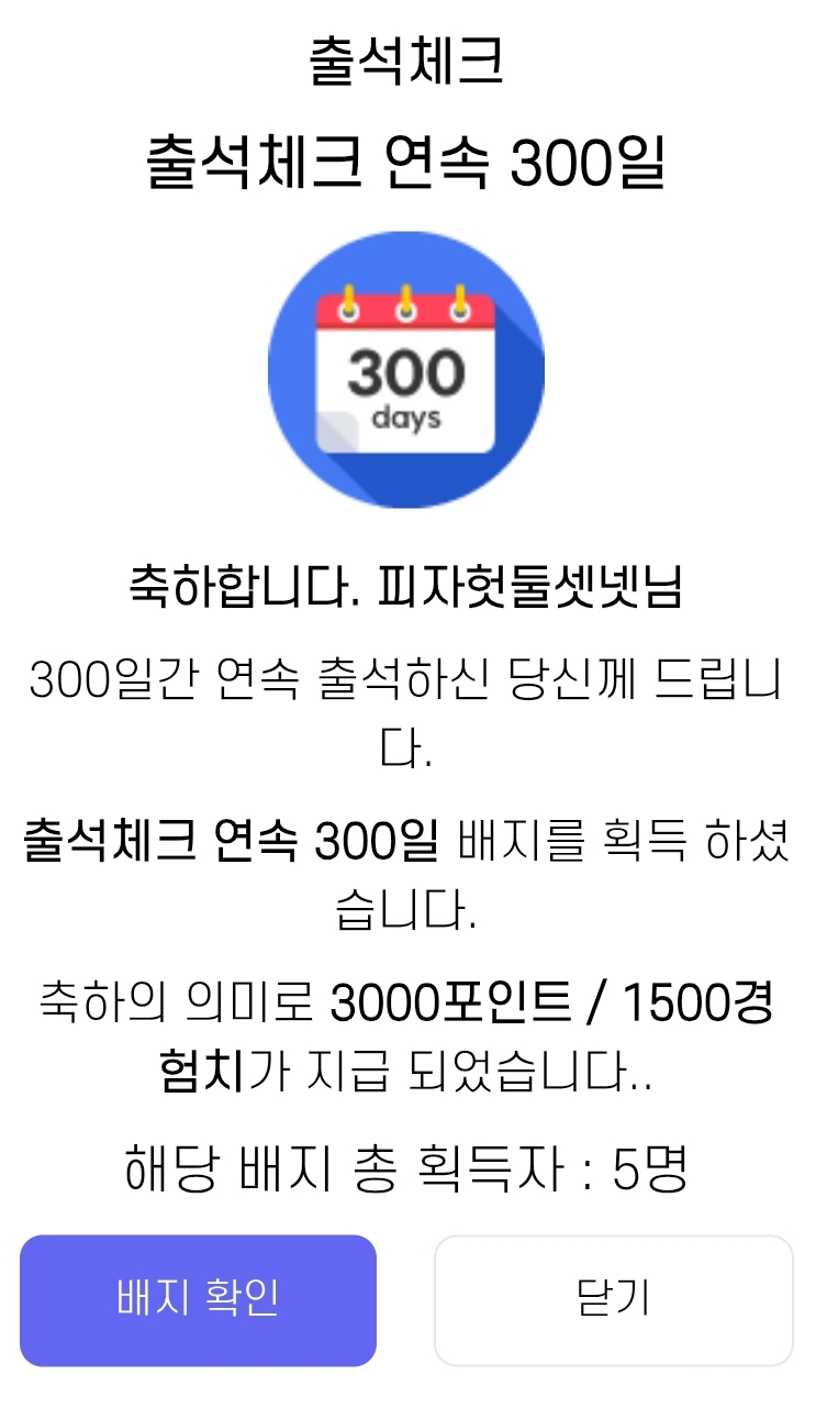 300일 연속 출석 배지 칭호를 얻었습니다.