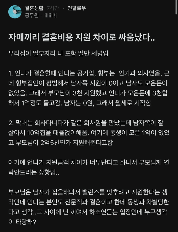 자매끼리 결혼비용 지원 차이로 싸움났다..