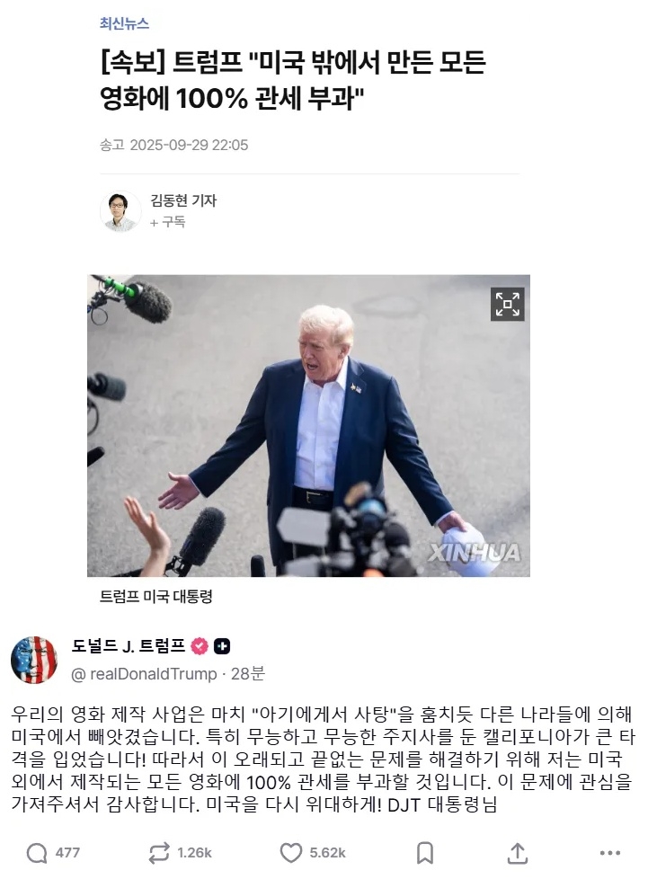 트럼프 미국 밖에서 만든 모든 영화에 100% 관세 부과
